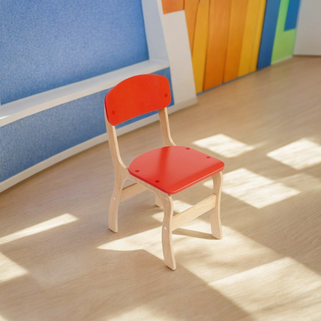 Scaun cu design prietenos și sigur, ideal pentru grădinițe și spații educaționale. Spătarul și șezutul sunt fabricate din placaj curbat de 8 mm, acoperite cu vopsea acrilică pe bază de apă, non-toxică. Picioarele sunt realizate din placaj lustruit de 15 mm, finisate cu lac acrilic ecologic. Toate elementele sunt asamblate cu feronerie ascunsă, sigură pentru copii. Materialele utilizate sunt durabile și nu conțin substanțe chimice nocive.