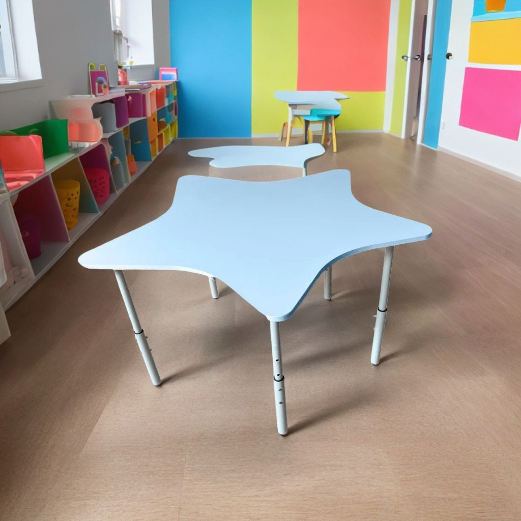 Masă reglabilă pentru copii, cu cinci locuri, ideală pentru activități de grup. Blatul în formă de stea este realizat din PAL melaminat colorat de 16 mm, cu cant ABS de 1 mm și colțuri rotunjite pentru siguranță. Cadrul metalic are profile rotunde, reglaj telescopic pentru înălțimi de 460, 520 sau 580 mm, garnituri din plastic și picioare vopsite electrostatic, prevăzute cu capace din plastic. Îmbinările sunt sigure, cu șuruburi și piulițe ascunse.