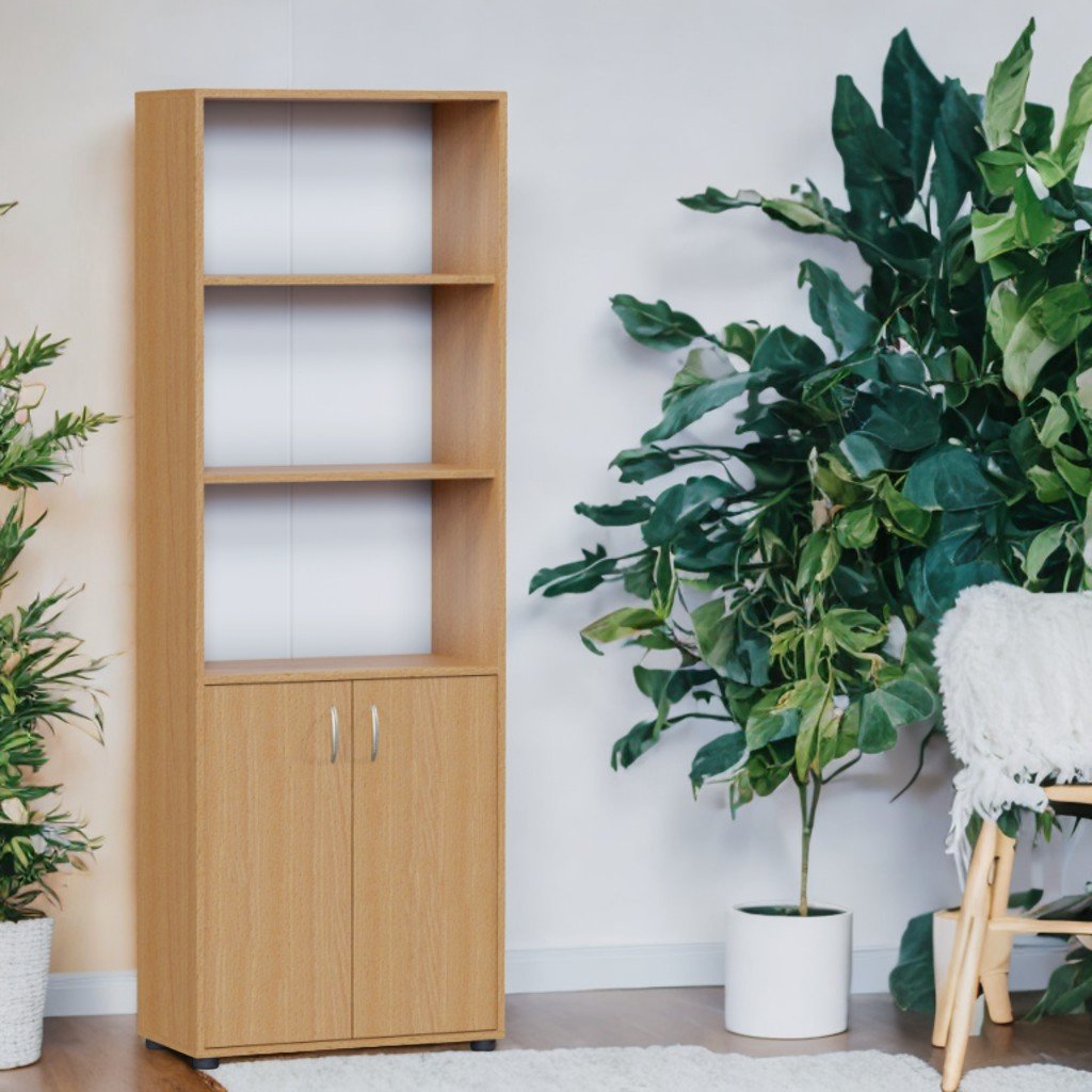 Dulap – dimensiuni: 802×403×1816 mm, greutate: 48 kg. PAL melaminat 18 mm, spate PFL alb 3 mm. Fațadă cu cant ABS 1 mm, interior 0,5 mm. 3 nișe deschise, 2 rafturi închise, minere cromate. Rafturi reglabile. Picioare din plastic reglabile. Culori: fag, stejar deschis. Asamblare sigură.