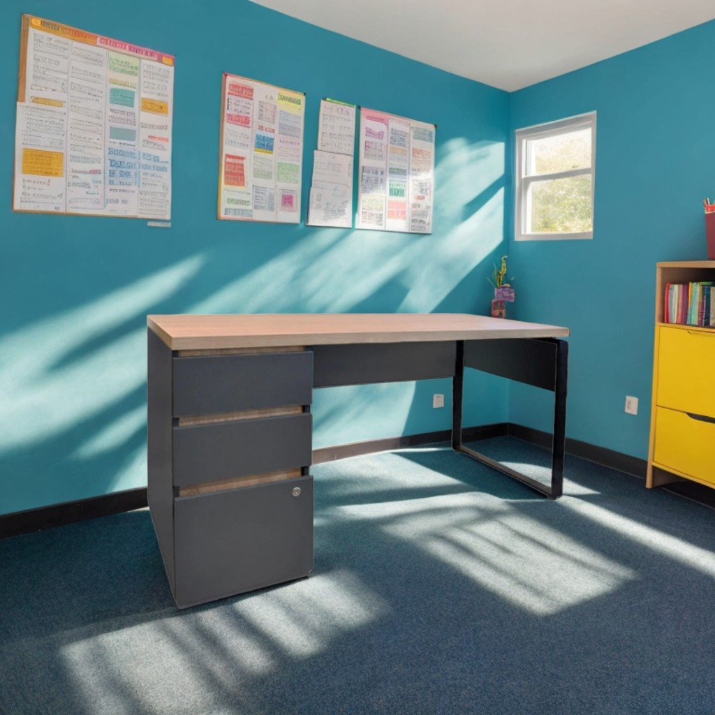 Masă birou 1500x680x750 mm, blat PAL 36 mm, structură PAL 18 mm, suport metalic cu design original, 3 sertare, picioare reglabile. Culori: stejar Sonoma/antracit; alb/alb.