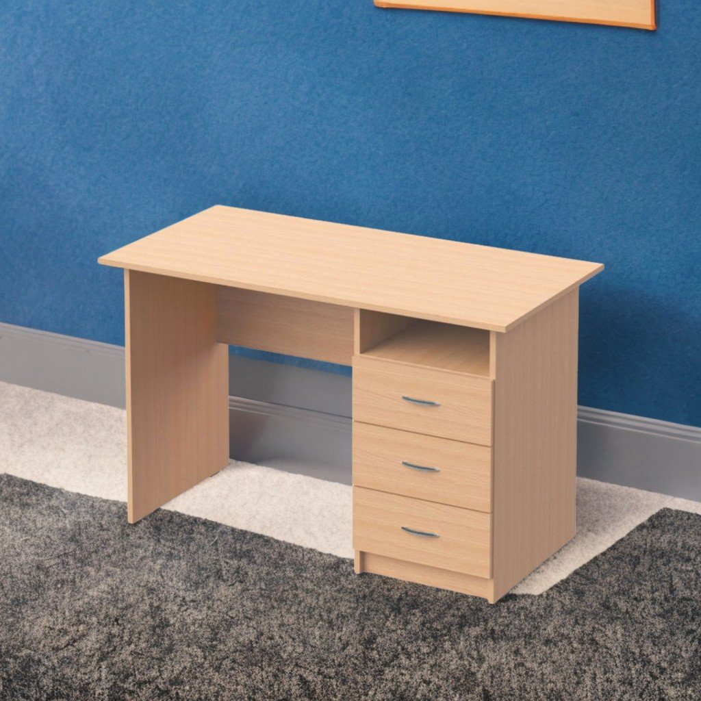Masă birou, 1200×600×750 mm, 42,86 kg. PAL melaminat 18 mm, cant ABS (1 mm fațadă, 0,5 mm interior). Sertare (3) și nisa deschisă pe dreapta. Asamblare sigură. Garnituri protecție. Culori: fag, stejar deschis, fag artizan perlat, gri.