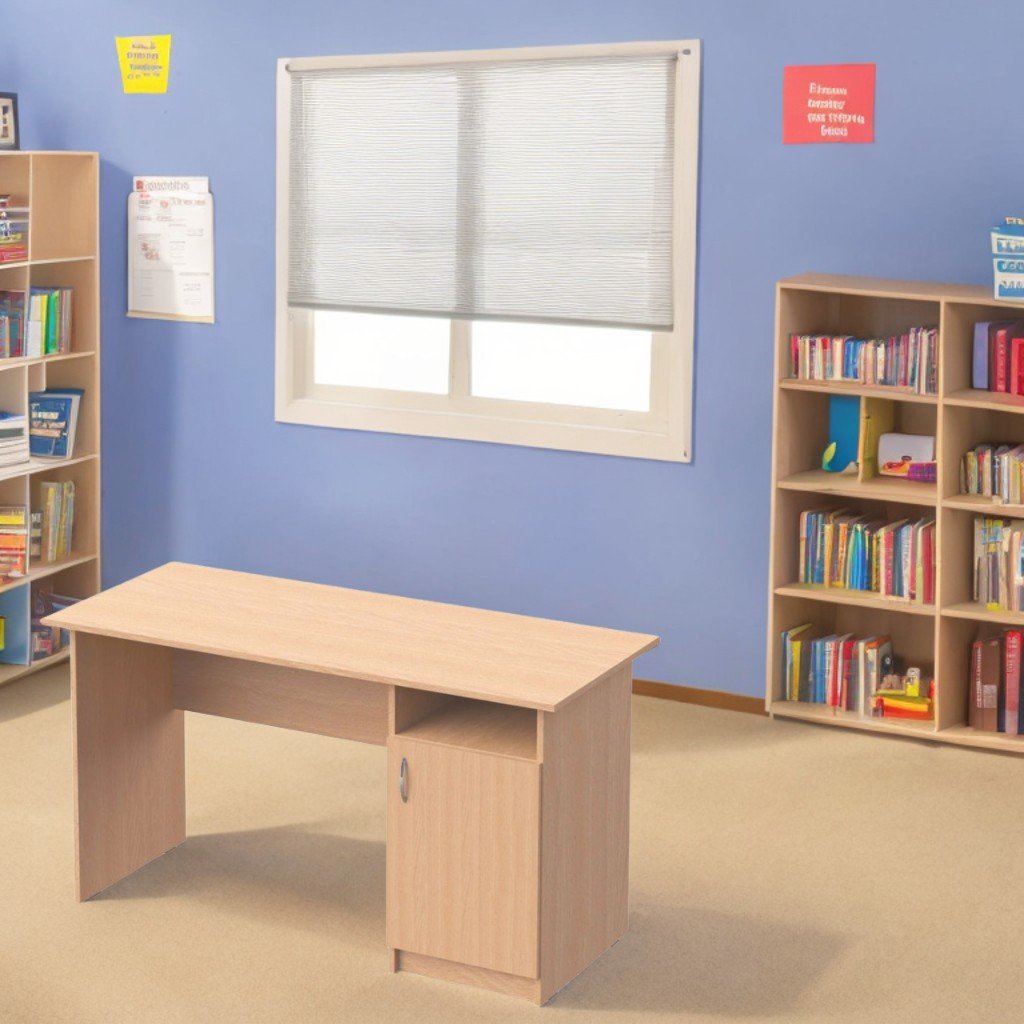 Masă birou, 1200×600×750 mm, 42,86 kg. PAL melaminat 18 mm, cant ABS (1 mm fațadă, 0,5 mm interior). Nisa deschisă + 2 rafturi închise cu mâner cromat (dreapta). Placă de rigidizare. Asamblare sigură. Garnituri protecție. Culori: fag, stejar deschis, fag artizan perlat, gri.