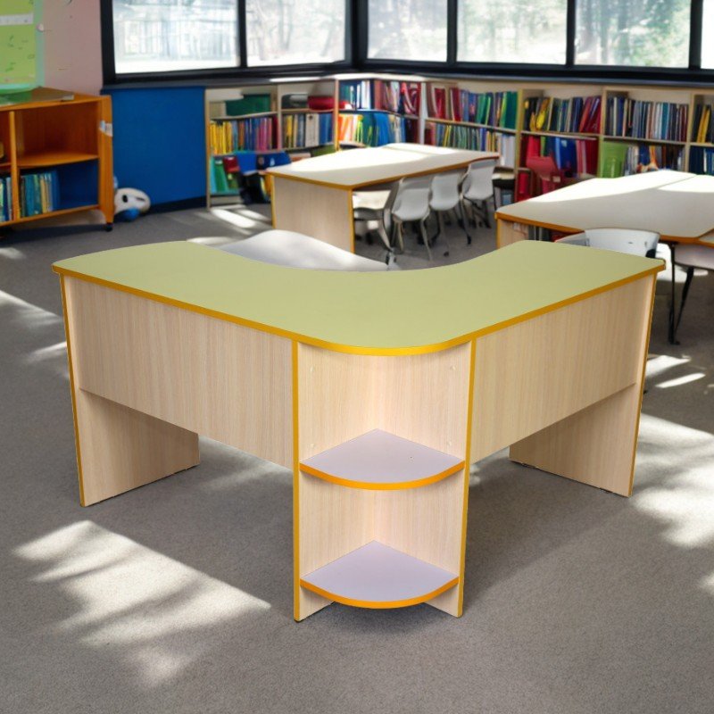 Masă 1300x1300x750 mm + dulăpior 400x400x590 mm, PAL melaminat 18/16 mm, cant ABS 1 mm, colțuri rotunjite, rafturi deschise. Opțional: dulăpior mobil cu 3 sertare / 2 rafturi deschise / 2 rafturi închise. Culoare: blat jasmin, cadru stejar deschis, fațade lavanda.