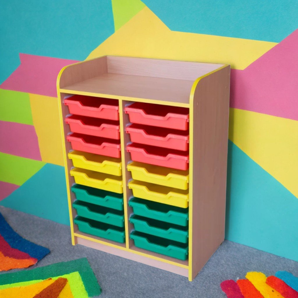 Include 16 cutii din plastic în culorile galben, roșu și verde, plus o poliță superioară pentru depozitare suplimentară.