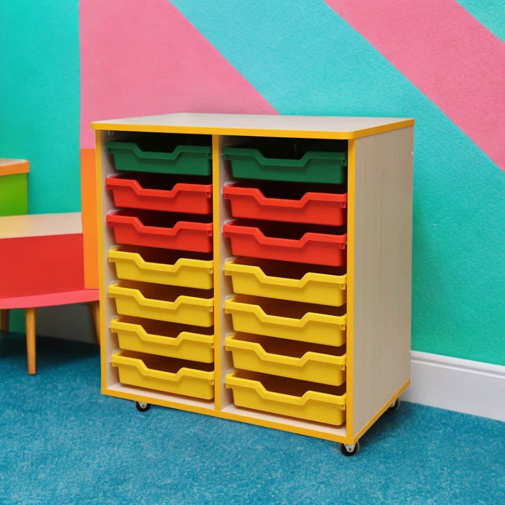 Include 14 cutii din plastic în culorile galben, roșu și verde, de dimensiuni variate, și o poliță amplasată deasupra. Perfect pentru organizarea jucăriilor sau a materialelor educaționale.