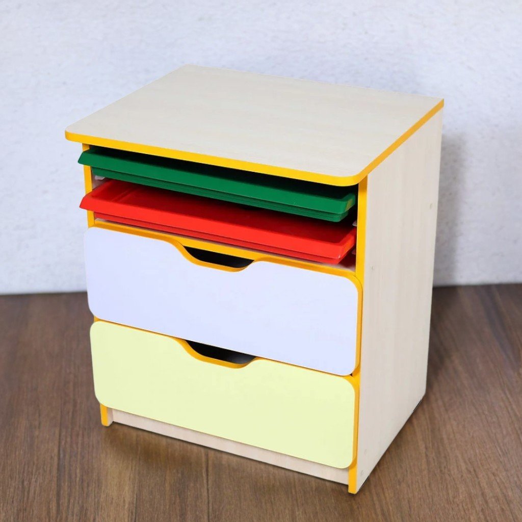 Dotat cu 2 sertare cu colțuri rotunjite și decupaj special pentru deschidere. Include lăzi din plastic Gratnells, format A1 (525 x 470 x 43 mm), în culorile roșu și verde.