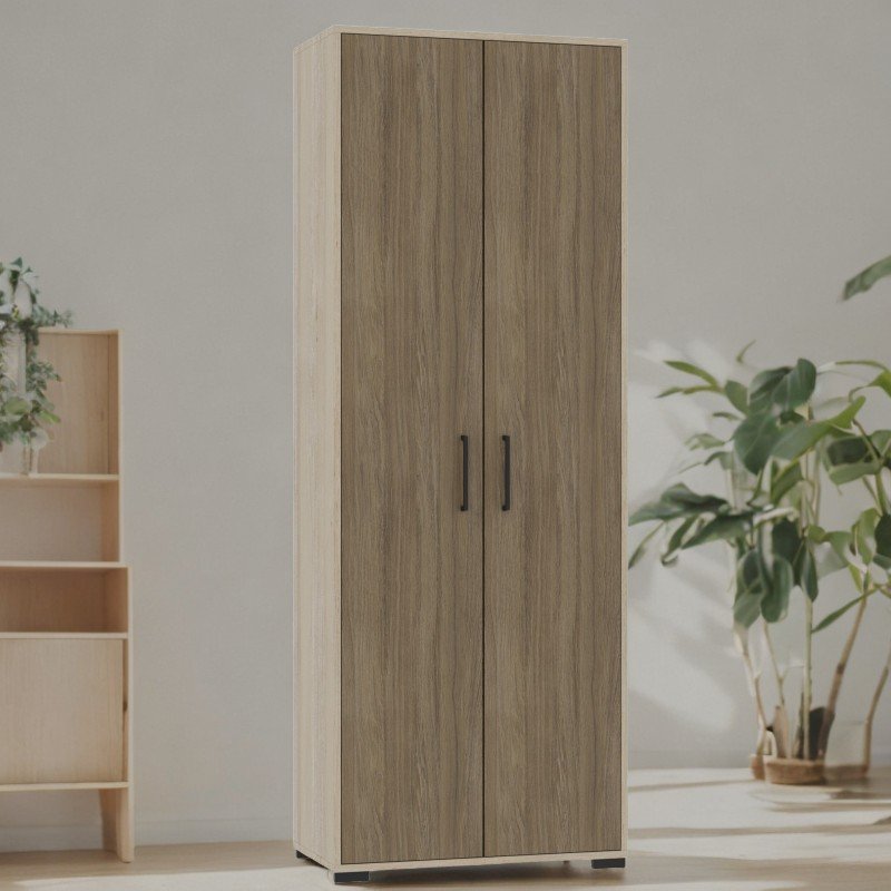 Dimensiuni (L×l×h): 719×405×2025 mm. Dulapul este realizat din PAL laminat cu grosime de 18 mm. Fațada este finisată cu cant ABS de 1 mm, iar componentele interioare sunt prevăzute cu cant de 0,5 mm. Peretele din spate este din PFL melaminat alb, cu grosime de 3 mm. Dulapul este echipat cu două rafturi și o bară retractabilă pentru umerașe. Componentele sunt asamblate cu elemente de fixare sigure și permit montaj pe perete. Baza dulapului este dotată cu picioare din plastic. Culori disponibile: perlă artizan, stejar urban cafeniu.