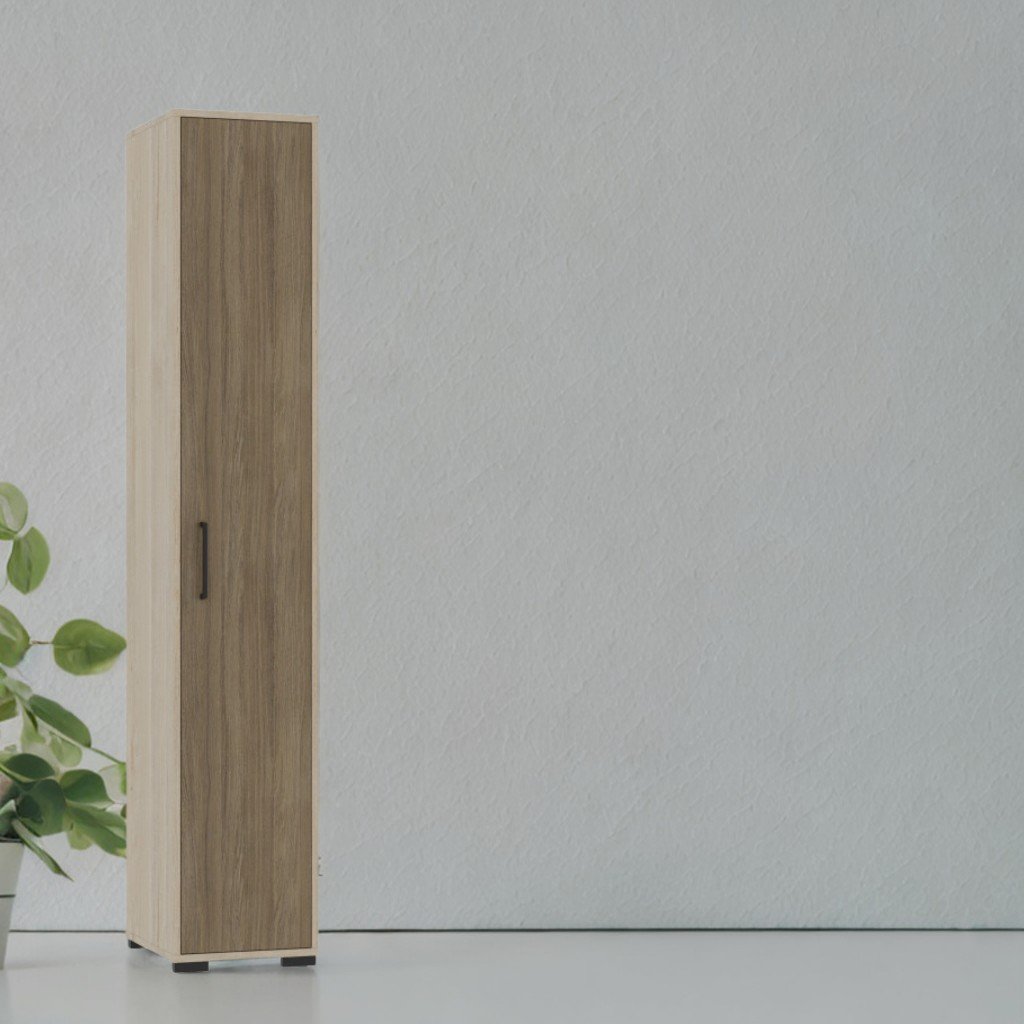 Dimensiuni (L×l×h): 360×405×2025 mm. Dulapul este realizat din PAL laminat cu grosime de 18 mm. Fațada este finisată cu cant ABS de 1 mm, iar piesele interioare cu cant de 0,5 mm. Spatele dulapului este confecționat din PFL melaminat alb, cu grosime de 3 mm. Dulapul conține 5 rafturi, dintre care 3 sunt reglabile pe înălțime. Piesele sunt asamblate cu elemente de fixare speciale și sigure, prevăzute pentru montaj pe perete. Dulapul este dotat cu picioare din plastic. Culori disponibile: perlă artizan, stejar urban cafeniu.