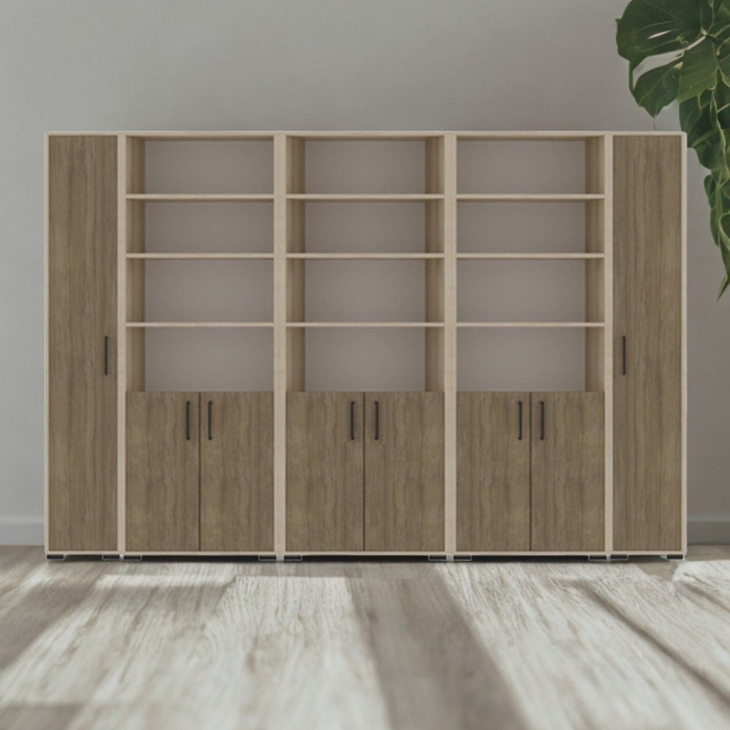 Dimensiuni (L×l×h): 2877×405×2025 mm. Set de mobilier din PAL melaminat 18 mm, cu cant ABS: 1 mm fațade, 0,5 mm interior. Spate din PFL alb 3 mm. Compus din 5 corpuri: 2 dulapuri-coloană cu 5 rafturi (3 reglabile) și 3 dulapuri semi-închise cu rafturi deschise sus și rafturi închise jos. Asamblare sigură, picioare din plastic. Culoare: perla artizan, stejar urban cafeniu.