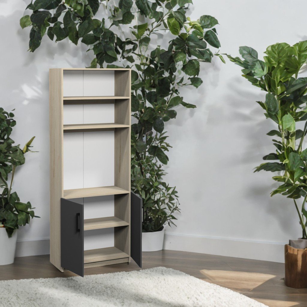 Dulap – dimensiuni: 800×370×2110 mm. PAL melaminat 18 mm, spate PFL alb 2,5 mm. Fațade gri grafit, corp Perlă Beech Artisan. 2 rafturi închise reglabile, 3 rafturi deschise (1 pentru obiecte mari). Raft deschis detașabil. Fixare sigură, picioare metalice reglabile (0–30 mm).