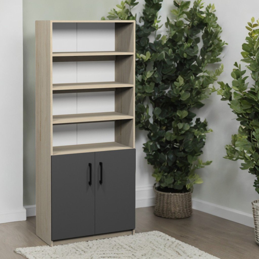 Dulap – dimensiuni: 800×370×1910 mm. PAL melaminat 18 mm, spate PFL alb 2,5 mm. Corp Perlă Beech Artisan, fațade Gri grafit. 2 rafturi închise reglabile, 4 rafturi deschise (1 detașabil pentru obiecte mari). Fixare sigură, picioare metalice reglabile (0–30 mm).