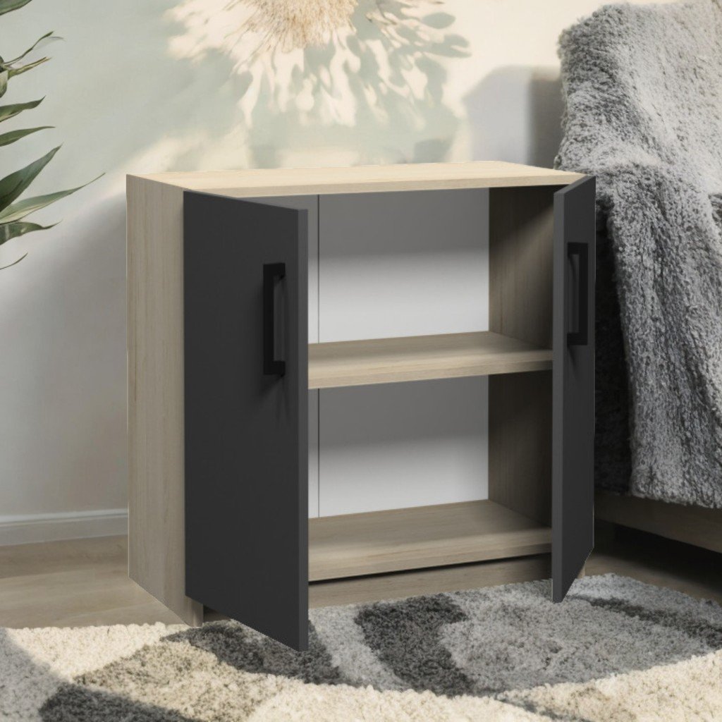 Dulap – dimensiuni: 800×370×780 mm. PAL melaminat 18 mm, spate PFL alb 2,5 mm. Corp Perlă Fag Artizan, fronturi Gri grafit. 2 rafturi închise reglabile. Fixare sigură, picioare metalice reglabile (0–30 mm).