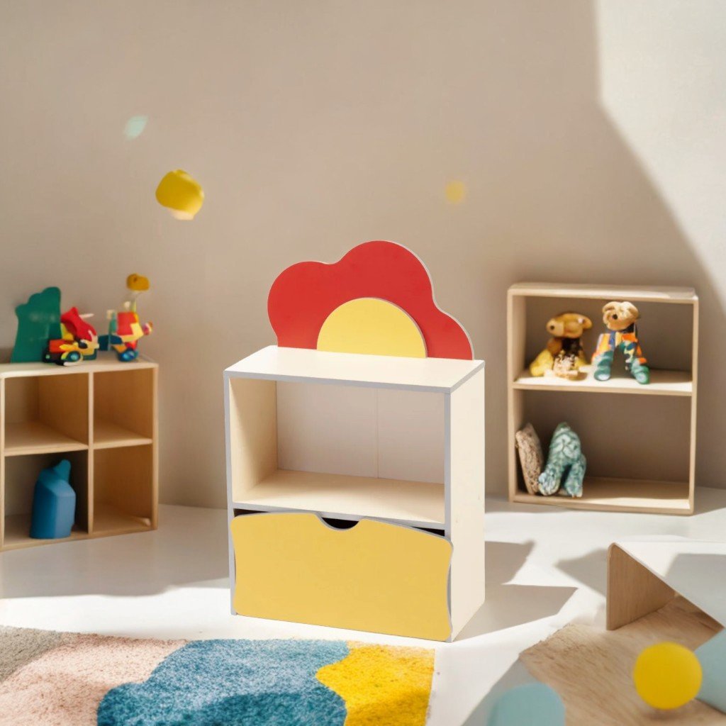 Designul este completat de un element decorativ în formă de floare, iar piesele sunt asamblate cu elemente de fixare speciale și sigure. Dulapul se fixează pe perete pentru a asigura protecția copiilor și este dotat cu garnituri din plastic rezistent.