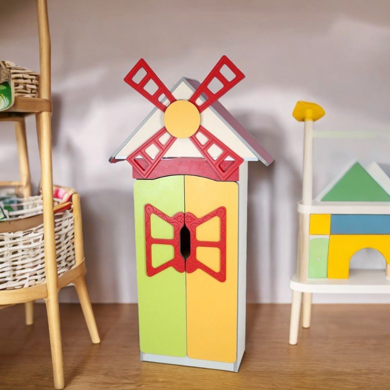 Dulapul include 4 rafturi spațioase și uși cu colțuri rotunjite, dotate cu decupaje speciale pentru deschidere facilă. Ușile sunt decorate cu aplicații din MDF colorat, reprezentând elemente de inspirație rustică, specifice unei mori.