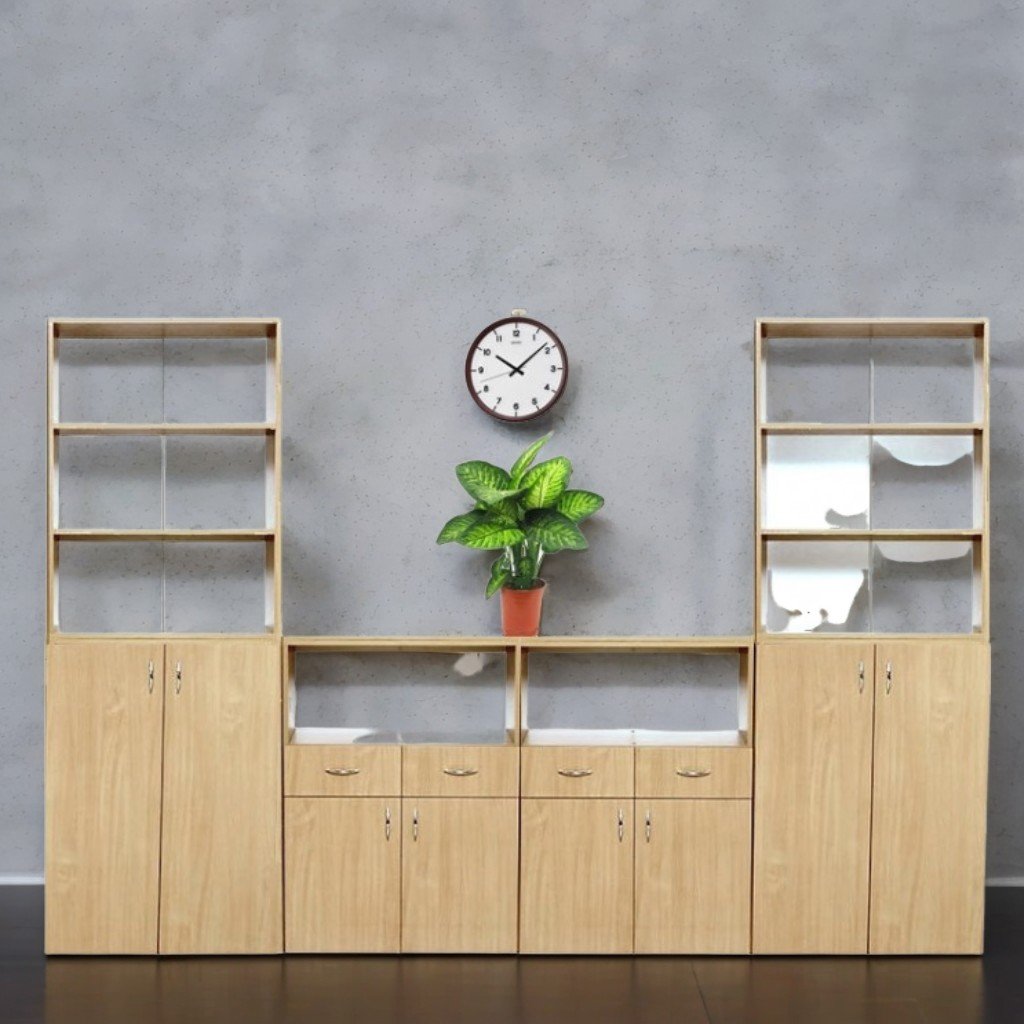 Dimensiuni (L×l×h): 3200×400×2200 mm. Set de mobilier realizat din PAL melaminat de 18 mm grosime. Fațada este finisată cu cant ABS de 1 mm, iar piesele interioare cu cant ABS de 0,5 mm. Spatele este din PFL melaminat alb de 3 mm grosime. Setul conține 4 compartimente: compartimentele 1 și 4 au câte 3 nișe și 3 rafturi închise; compartimentele 2 și 3 au câte o nișă, 2 sertare și 2 rafturi închise. Dulapurile sunt unite cu dibluri din lemn și au mânere cromate. Toate piesele sunt asamblate cu elemente de fixare speciale și sigure. Setul are picioare din plastic reglabile. Culori: fag, stejar deschis.