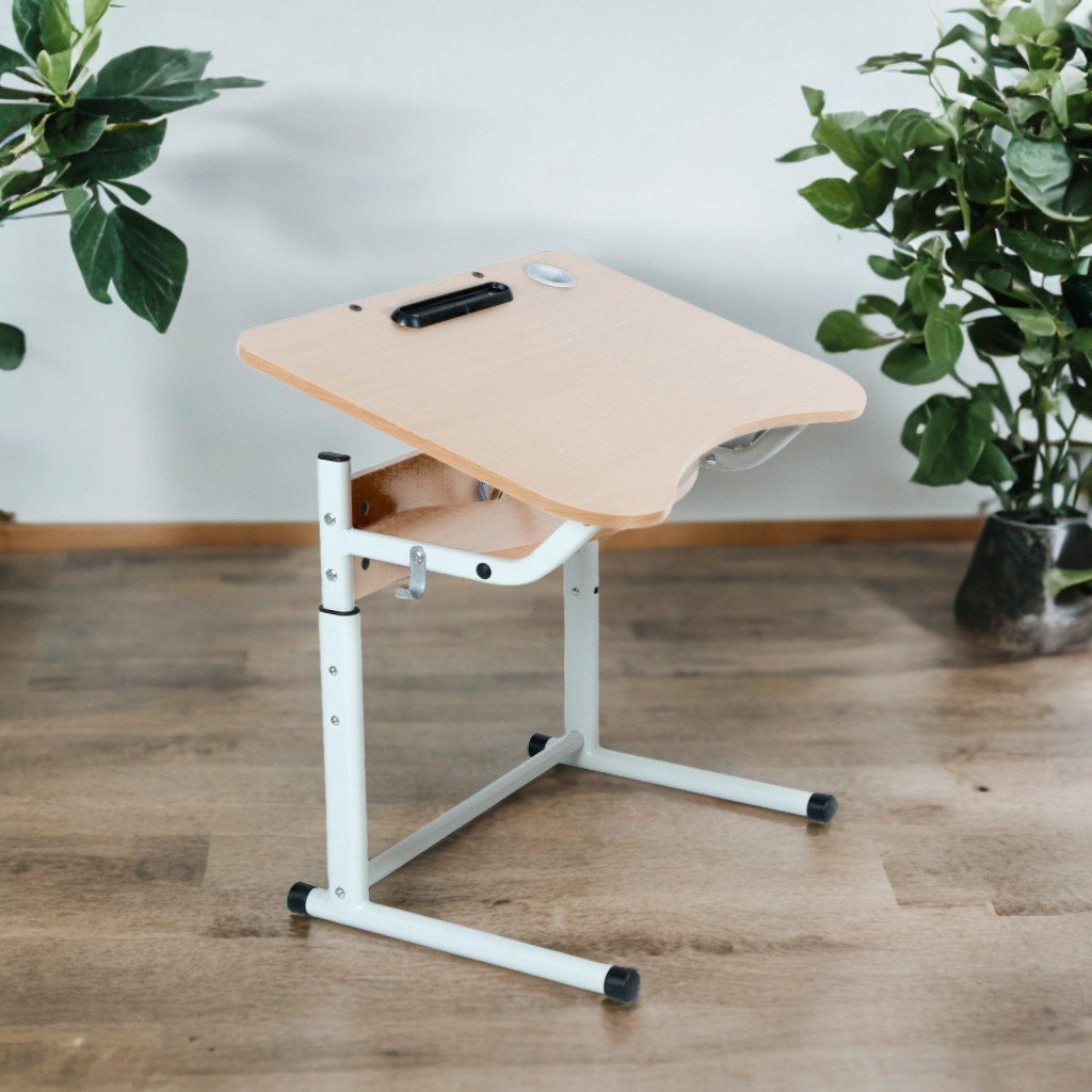 Bancă școlară individuală anti-scolioză, reglabilă (gr. 3–6), cu poliță și cadru oval. Dimensiuni: 700x500 mm. Greutate: 10,6 kg. Înălțime ajustabilă: 580/640/700/760 mm. Blat rabatabil cu unghi de înclinare: 0°–16°. Blat ergonomic din PAL melaminat de 16 mm cu cant ABS 1 mm. Față și poliță din PAL de 16 mm și 0,5 mm. Dotări: suport pentru carte, pahar, compartiment pixuri, agățător ghiozdan. Cadru metalic rotund (Ø25/32 mm, grosime 1,2 mm), îmbinare telescopică cu garnituri de protecție. Vopsire electrostatică și polimerizare. Culoare blat: fag, stejar deschis, galben/lămâie verde, sakura/lavandă. Culoare cadru: verde, galben, gri, gri grafit.