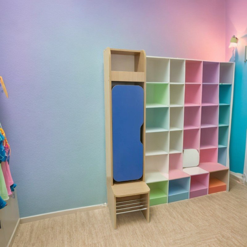 Structura este asamblată cu elemente de fixare sigure, fixată pe perete pentru stabilitate și prevăzută cu garnituri din plastic rezistent. Cadrul este de culoare fag, iar ușa este disponibilă în mai multe nuanțe vesele: galben, verde lămâie, albastru, oranj și roșu.