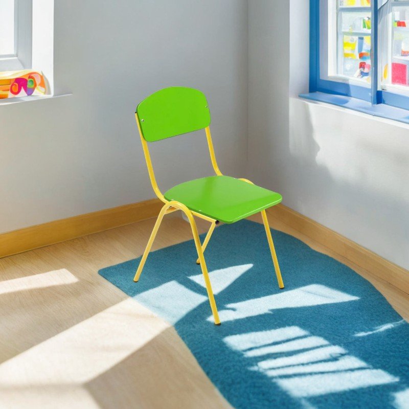 Are spătarul și șezutul fabricate din placaj ușor curbat, vopsit, cu grosimea de 8 mm, acoperit cu vopsea acrilică pe bază de apă, non-toxică. Cadrul este realizat din profil metalic rotund de 16 mm diametru, grosime 1,2 mm, vopsit electrostatic și polimerizat. Scaunul are garnituri din plastic rezistent, iar toate componentele sunt asamblate cu nituri de aluminiu sigure. Culoarea carcasei este galben sau verde, iar spătarul și șezutul sunt disponibile în galben, roșu, albastru și verde.