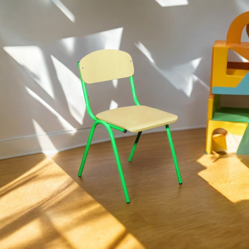 Scaun pentru copii cu structură metalică rotundă (Ø16 mm, grosime 1,2 mm), vopsită electrostatic. Șezutul și spătarul sunt realizate din placaj curbat de 8 mm, laminat cu strat HPL de 0,4–0,5 mm, rezistent la uzură. Prevăzut cu garnituri din plastic și asamblat cu nituri de aluminiu. Disponibil în culorile galben și verde. Garanție: 24 luni.