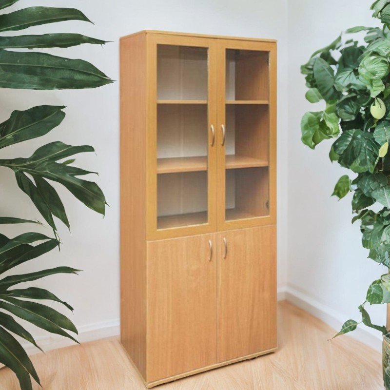 Dimensiuni (L×l×h): 802×403×1816 mm. Greutate: 64,18 kg. Dulapul este realizat din PAL melaminat cu grosime de 18 mm. Fațada superioară este confecționată din ramă MDF cu sticlă, iar partea inferioară este finisată cu cant ABS de 1 mm. Piesele interioare sunt încleiate cu cant ABS de 0,5 mm. Peretele din spate este din PFL melaminat alb, cu grosime de 3 mm. Dulapul include 3 rafturi vizibile cu uși din sticlă și 2 rafturi închise, cu posibilitatea reglării distanței dintre ele. Este dotat cu mânere cromate și picioare din plastic reglabile. Piesele sunt asamblate cu elemente de fixare speciale și sigure. Culori disponibile: fag, stejar deschis.