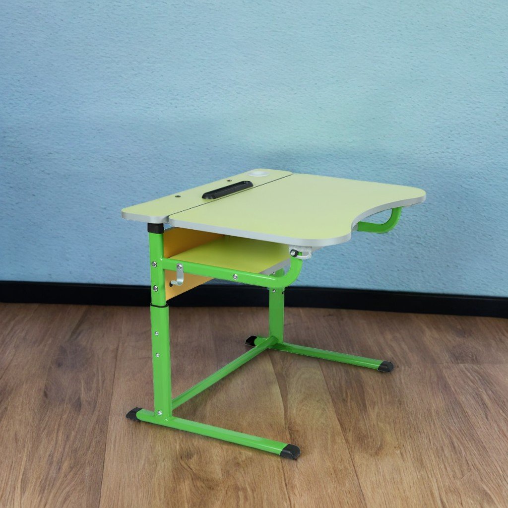 Dimensiuni (LxL): 700x590 mm; Greutate: 13,5 kg; Înălțime reglabilă: 640/700/760/820 mm; Unghi inclinare blat: 0°,1°,3.5°,6°,8°,10°,12°,14°,16°; Blat PAL melaminat 18 mm cu cant ABS 1,00 mm; Partea frontală și polița PAL melaminat 16 mm, respectiv 0,5 mm; Blat format din 2 părți: orizontal cu compartiment pixuri, suport pahar și carte + blat de lucru reglabil; Blat neted cu colțuri rotunjite, fixat pe profile metalice cu șuruburi ascunse; Poliță depozitare și agățători ghiozdan; Profile ovale 50x30, 38x20, 30x15 mm, grosime 1,2 mm, cu garnituri din plastic; Profile vopsite electrostatic și polimerizat, protecție pardoseală; Marcaje grupuri creștere la reglare; Culori blat: galben/lămâie verde, sakura/lavandă, fag, stejar deschis; Culori cadru: verde, galben, gri, gri grafit.