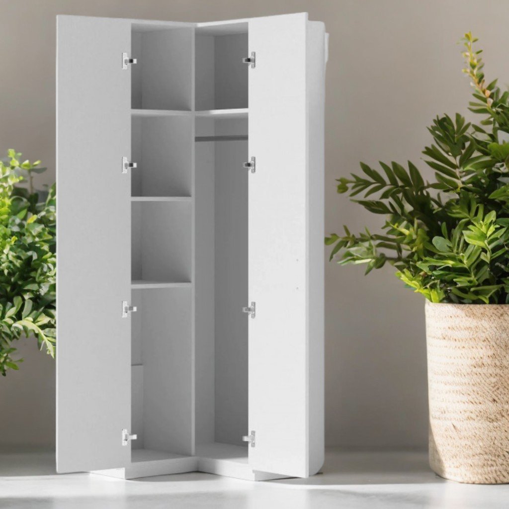 Dulap colțar, 800x400x2000 mm. PAL melaminat 18 mm, cant ABS (fațadă 1 mm, interior 0,5 mm), spate PFL alb 3 mm. 4 rafturi stânga, bară umerașe + raft dreapta, mânere cromate, asamblare sigură. Culori: stejar sonoma, frasin alb.