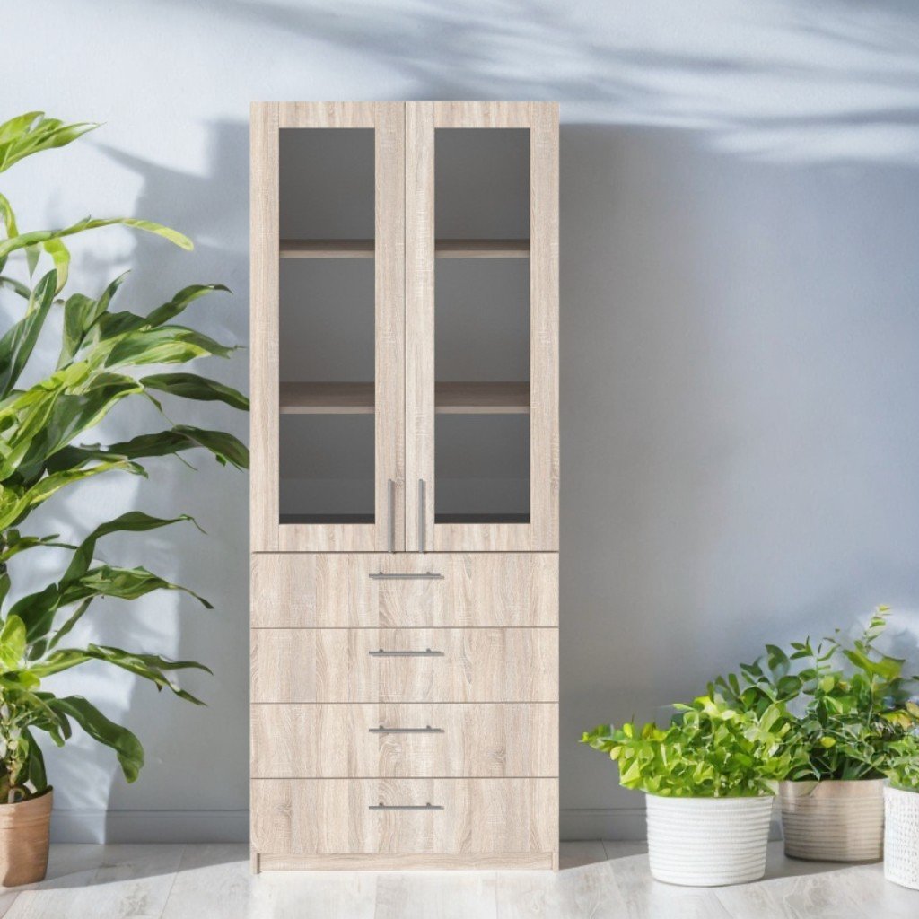 Dimensiuni (L×l×h): 800×400×2000 mm. Dulap realizat din PAL melaminat cu grosimea de 18 mm. Fațada este finisată cu cant ABS de 1 mm, iar piesele interioare cu cant de 0,5 mm. Spatele este realizat din PFL melaminat alb, grosime 3 mm. Dulapul are în partea superioară 2 rafturi vizibile cu uși din sticlă încadrate în ramă, iar în partea inferioară două uși din PAL cu rafturi închise. Este dotat cu mânere cromate și permite reglarea distanței dintre polițe. Piesele sunt asamblate cu elemente de fixare speciale și sigure. Culori disponibile: stejar sonoma, frasin alb.