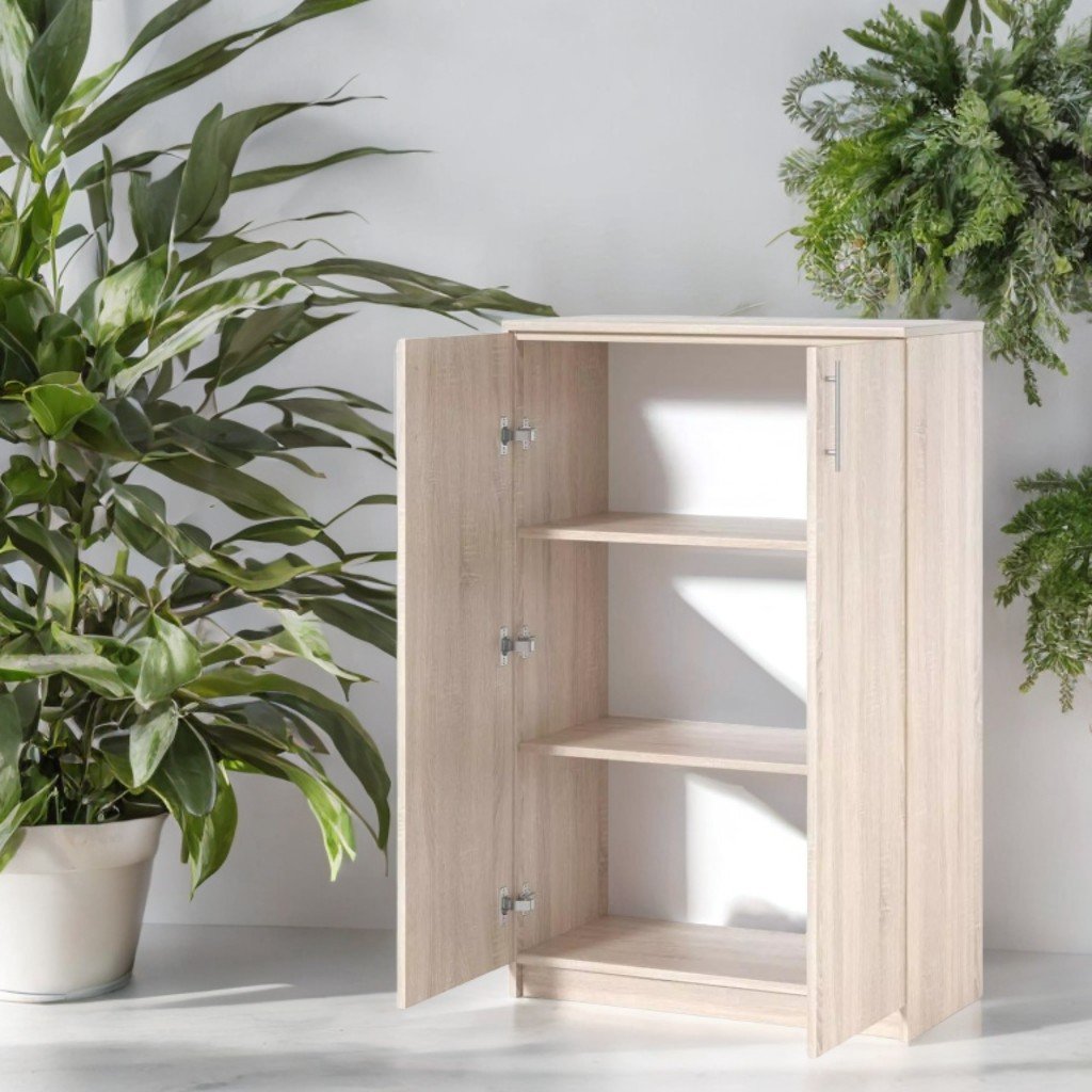 Dulap, 800x400x1260 mm. PAL melaminat 18 mm, cant ABS (fațadă 1 mm, interior 0,5 mm), spate PFL alb 3 mm. 3 rafturi pentru depozitare, mânere cromate, asamblat cu feronerie sigură. Culoare: stejar sonoma.
