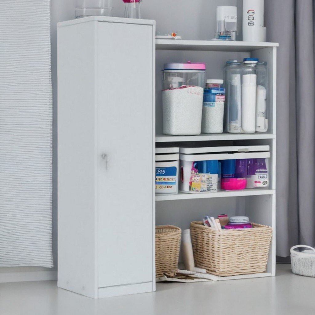 Interiorul include patru polițe de dimensiuni reduse, ideale pentru depozitarea obiectelor de curățenie sau uz casnic, și un compartiment special destinat găleții, mopului sau măturii. Partea superioară este dotată cu un cârlig practic pentru agățarea umerașelor.